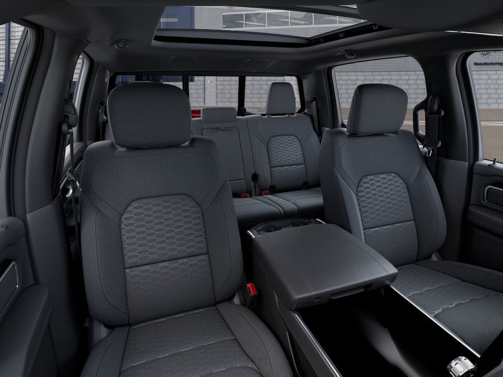 Quick Order Package 27Z Big Horn. Big Horn Level 2 Equipment Group: Google Android Auto; SiriusXM Radio Service; USB Host Flip; Power Adjustable Pedals; Leather Wrapped Steering Wheel; Integrated Voice Command with Bluetooth; 12 Touchscreen Display; Glove Box Lamp; Auto Power-Folding Mirrors; 115V Auxiliary Rear Power Outlet; Media Hub with 2 Charge Only USBs; Heated Front Seats; Security Alarm; Black Premium Power Mirrors; Apple CarPlay; Premium Overhead Console; 9 Amplified Speakers with Subwoofer; Disassociated Touchscreen Display; Body Color Fender Flares; Remote Tailgate Release; 115V Auxiliary Power Outlet; LED Dome Lamp with On/off Switch; Universal Garage Door Opener; 2nd Row in Floor Storage Bins; Sun Visors with Illuminated Vanity Mirrors; LED Footwell Lighting; Rear Window Defroster; Integrated Center Stack Radio; Rear View Auto Dim Mirror; Rear Power Sliding Window; Connectivity - US/Canada; GPS Navigation; 4G LTE Wi-Fi Hot Spot; GPS Antenna Input; Overhead LED Lamps; Exterior Mirrors with Heating Element; Auto Dim Exterior Driver Mirror; SiriusXM with 360L; Global Telematics Box Module; Connected Travel and Traffic Services; Heated Steering Wheel; Black Exterior Mirrors; Configurable Drive Mode; 400W Inverter; HD Radio; Deluxe Cloth Bucket Seats; Uconnect 5 Navigation with 12.0 Display Radio; Exterior Mirrors with Supplemental Signals; Steering Wheel Mounted Audio Controls; Exterior Mirrors Courtesy Lamps; Air Conditioning ATC with Dual Zone Control; Cluster 7.0 TFT Color Display; Convex Wide-Angle Exterior Mirror Insert. Quick Order Package 23Z Big Horn. 20 X 9 Aluminum Chrome Clad Wheels. Dual-Pane Panoramic Sunroof. RamBox Cargo Management System. 9 Amplified Speakers with Subwoofer. Molten Red Pearlcoat. MyFlexCare Service Plan. MOPAR Front and Rear Rubber Floor Mats. 3.92 Rear Axle Ratio. **Equipment listed is based on original vehicle build and subject to change. Please confirm the accuracy of the included equipment by calling the dealer prior to purchase.**